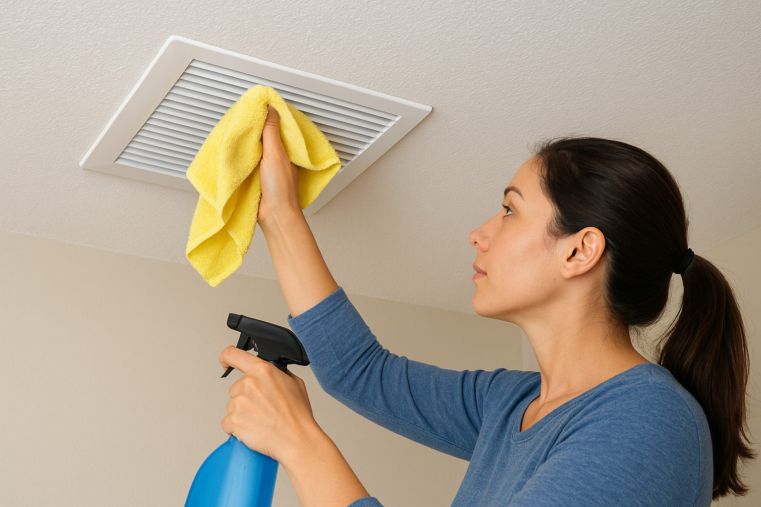 Vacuum or dust the exposed vent and surrounding ceiling. For stubborn buildup, use a damp microfiber cloth with your cleaning solution.